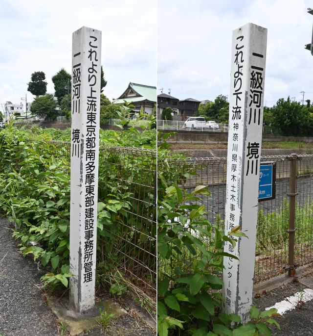 東京都町田市と横浜市瀬谷区の都県境付近の左岸・右岸に境川管理限界標識設置されています。左岸は都県境ですが、これより上流は川が都県境です。標識には「これより上流東京都南多摩郡東部建設事務所管理」、反対側に「これより下流神奈川県厚木土木事務所東部センター管理」と書かれています。こちらが現代の境なのかも知れません。
