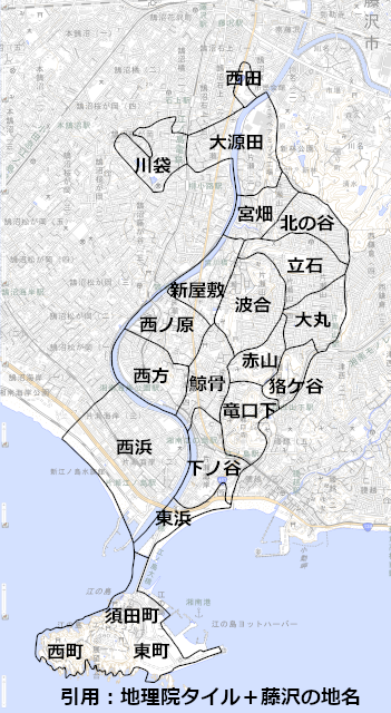 現在は藤沢市片瀬地区がそれにあたります。住居表示地区につき、片瀬一~五丁目・片瀬海岸一~三丁目・片瀬山一~五丁目・片瀬目白山・江の島一~二丁目となります。