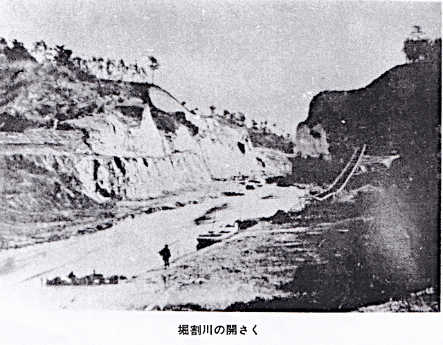 明治時代初期、台地西側のくびれた弥八ヶ谷戸(現中村橋付近)の丘陵を切り下げ(*1)、その南北を開削して掘割川を完成します。この工事で出た土砂で吉田新田・南一つ目沼(現中区吉浜町一帯)を埋め立てます。