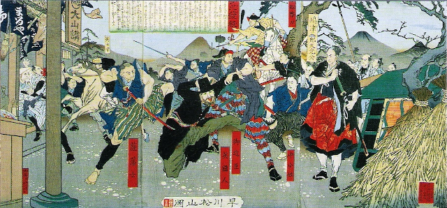 往時、関内居留地に住む外国人は、江戸を除く約40km(10里)の範囲に定められた外国人遊歩区域(*3)内を自由に外出できます。しかし幕末の世相は慌ただしく、尊王攘夷派武士などによる外国人殺傷事件が多発します。生麦事件(*4,1862)は、後に薩英戦争まで引き起こす外国人殺傷事件のなかで最も大事に至ります。