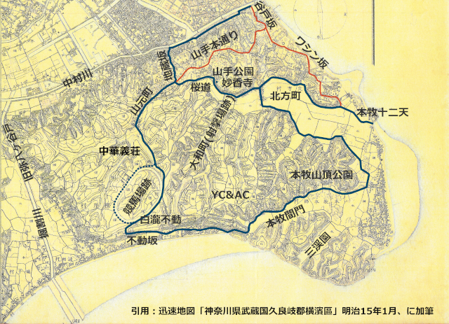 関内居留地から山手の尾根道を進み、根岸湾の波と戯れて関内居留地に戻る道筋です。ペリー提督がミッシッピー湾と命名した根岸湾や背後に広がる富士・箱根・伊豆の山々、次々に移り変わる景勝は異国で暮らす多くの外国人を慰め、楽しませます。