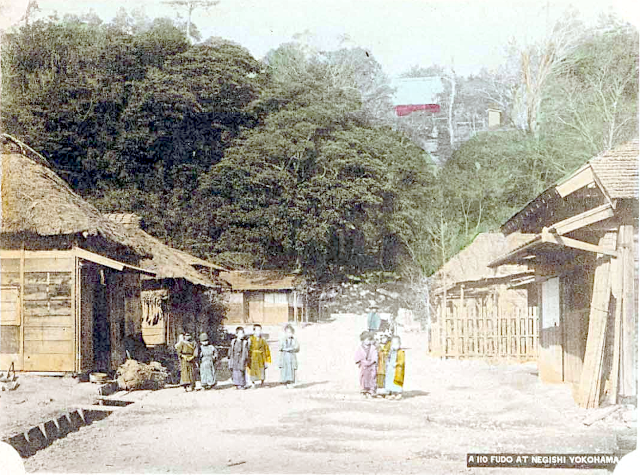 往時の写真、遊歩道南端近くの不動坂から根岸村・本牧岬(Treaty Point)・根岸湾(Mississippi Bay)の眺望(*1)および坂下の白滝不動前の茶屋(*2)、で様子が知れます。