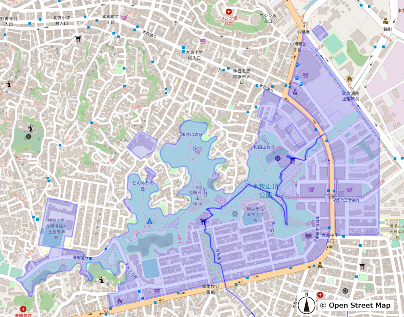*1 「本牧の接収地域」 薄青の塗潰しが接収地、青線はルート、次の資料から制作