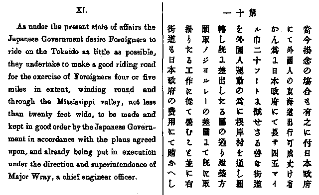1864年12月19日(元治1年11月21日)、横浜居留地覚書(第2回地所規則)が締約されます。居留地の整備・拡充の高まり、それに伴う自治制度の強化を目指します。その第11条は外国人遊歩道の規定です。