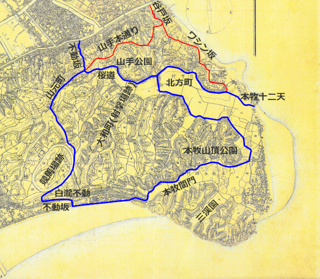 外国人遊歩道は 1865(慶応元)年9月に完成します。「迅速測図(*1)」に重ね、現在の地名を重ねたのが右図です。ここで青色は外国人遊歩道、赤色は参考の山手居留地の主要道路です。概ね往時の道筋を辿れますが、海岸線は昭和30年代以降の埋立により失われています。