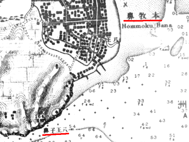 現本牧鼻は、1938(昭和13)年測量の海図「横濱付近」で「本牧鼻(八王子鼻)」と表記されています。