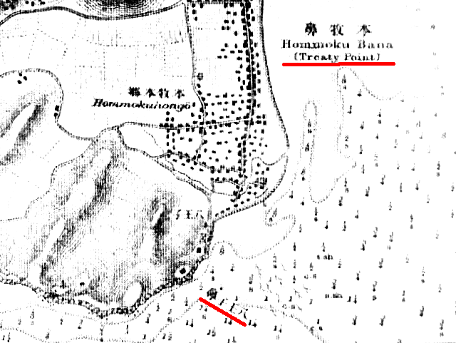 “Point Treaty(条約岬)”、ペリー提督が黒船で来航した時、直ちに江戸湾東岸の海図作成を命じますが、完成した海図に表記されていますが、本牧鼻として良いでしょう。表記された地点は本牧鼻より少し東側の平地で、岬と呼ぶには不適当、表記のずれと考えます。