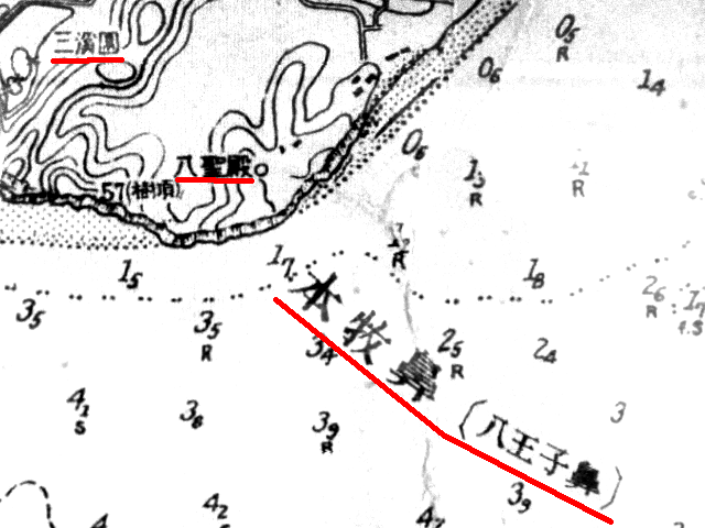 1923年よりさらに強い調子で「本牧鼻(八王子鼻)」と表記されています。これで今の認識に一致します。なお陸地部分に、八聖殿、三渓園が表記されていて、本牧鼻の位置が確固たるものになります。