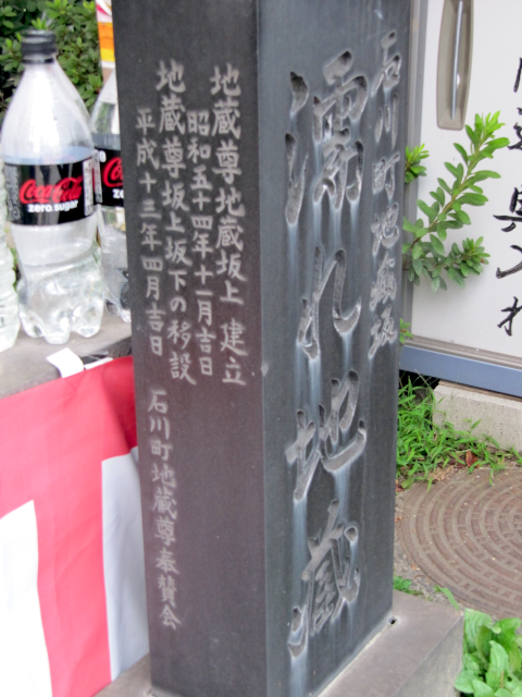 いま地蔵坂下、亀の橋東南詰に濡れ地蔵が鎮座しています。坂の名前は、このお地蔵様に因むと云われます。皆さんの信仰の証ですから、それが間違いとは思いません。しかし石柱に刻まれた来歴に「此地蔵尊地藏坂上 昭和五十四年十一月吉日 地蔵尊坂上坂下の移設 平成十五年四月吉日 石川町地蔵尊奉賛会」とあります。