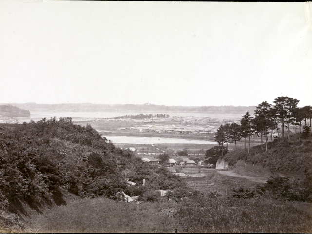 写真「View of Yokohama from the New Road(*2)」は、往時の地蔵坂上から見える風景と思われます。手前から中村川・埋立前の一つ目沼・太田屋新田・木の茂るあたりが州干島・横浜湾の向こうに神奈川。